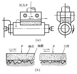 超精加工是用極細(xì)磨粒的油石進(jìn)行光磨的一種光整加工。其加工對(duì)象多為軸類(lèi)零件的外圓,亦可加工滾動(dòng)軸承溝道及平面等。如圖5.4.3所示,加工時(shí),裝有油石條的磨頭以恒定壓力P輕壓于工件表面。工件以v= 10~15 m/min的速度旋轉(zhuǎn),磨頭以0.1~0.15 mm/s的速度縱向進(jìn)給,同時(shí)作往復(fù)振動(dòng),振動(dòng)頻率為1 000~1 400 s/min,振幅為3~5 mm。磨粒在工件上的運(yùn)動(dòng)軌跡應(yīng)縱橫交錯(cuò)而不重復(fù)。油石條與工件之間要注入潤(rùn)滑油(一般為煤油加錠子油),以清除屑末并形成油膜。工件表面微觀凸峰首先被磨去,隨著各處凸峰高度的減低,油石與工件的接觸面積逐步加大,單位面積承受壓力隨之減小,當(dāng)壓力小于油膜表面張力時(shí),油石與工件將被油膜分離,切削作用自行停止超精加工生產(chǎn)率很高。