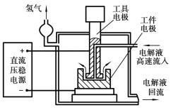 電解加工用直流穩(wěn)壓電源的工作電壓為6~24 V,工作電流為500~20 000 A。工具電極常用黃銅和不銹鋼等材料。用得較多的電解液是氯化鈉、硝酸鈉和氯酸鈉的水溶液。
