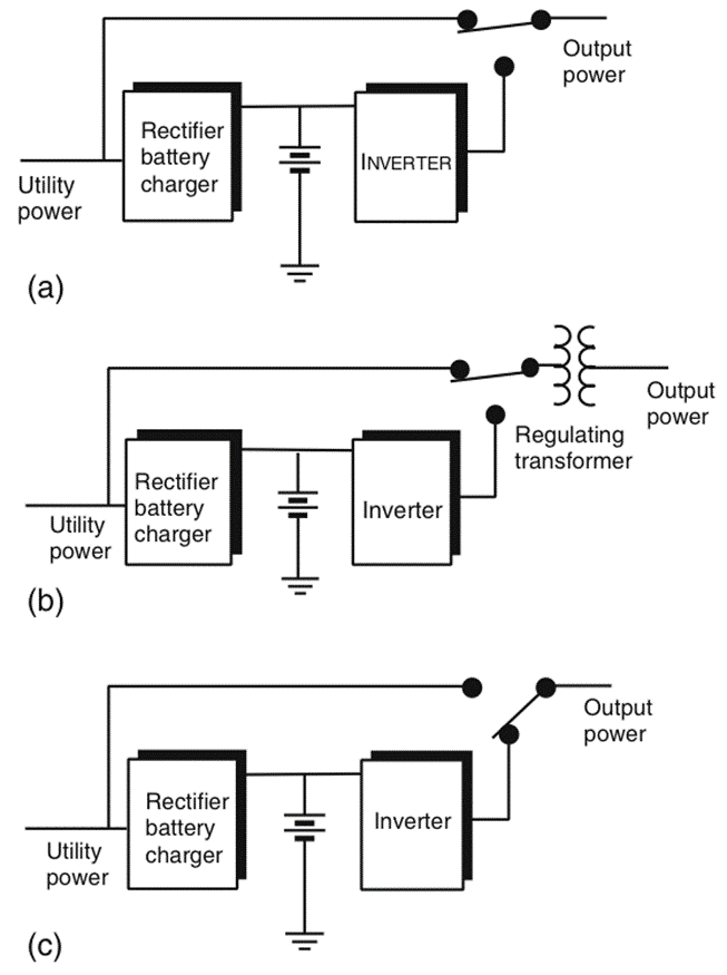 圖 2???? UPS 類型 (a) 備用、(b) 在線互動和 (c) 連續。