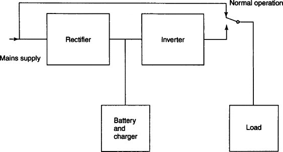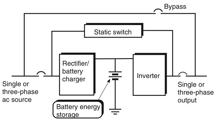 對于在線系統,整流器-逆變器組合在正常運行期間從交流電源提供負載電源。如果主電源出現故障,電池會自動向逆變器提供直流鏈路,并且不涉及時間延遲。如果整流器-逆變器系統出現故障,可以使用轉換開關將負載轉移到交流電源。