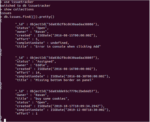 讓我向您解釋一個(gè)從MongoDB集合獲取數(shù)據(jù)的簡(jiǎn)短示例。假設(shè)我們的收藏名為“問(wèn)題”。在下面的示例中,我們從一個(gè)名為issues的集合中獲取數(shù)據(jù),并使用pretty()函數(shù)以更好的格式顯示數(shù)據(jù)。