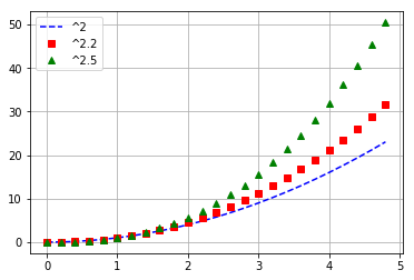 plt。繪圖(t,t**2,\'b--',label='^2')\'rs',\'g^')