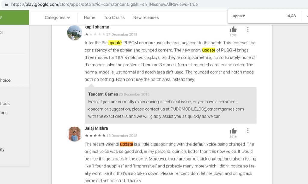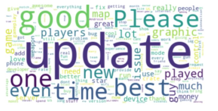 如果我們看看這里的“云”這個詞,它是根據谷歌play store對游戲PUBG的前80條評論構建的,我們會發現對游戲的總體反應是“好的”,有些人甚至稱之為“最好的”然而,似乎有些“更新”存在問題,人們正在懇求游戲創作者予以糾正。事實上,當我們在那天查看play store的評論時,我們看到了同樣的情況。