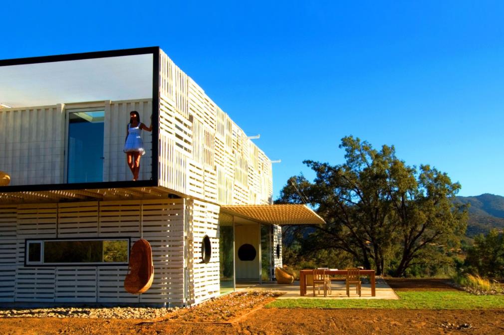 另一個(gè)智利美女, 宣言之家, 比其他制造鋼結(jié)構(gòu)房屋的例子要模糊一些。立面上覆蓋著回收的木制托盤, 以保護(hù)墻壁不受陽(yáng)光的傷害,并在冬季保持溫暖的空氣。盡管它的尺寸很大,但它只使用了三個(gè)海運(yùn)集裝箱,間隔開來(lái),用玻璃板和其他材料連接在一起,給人一種開闊的感覺(jué)。并且主要使用太陽(yáng)能發(fā)電供電。