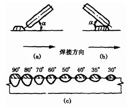 (2)電極(焊絲)傾角焊接時(shí),電極(焊絲)相對(duì)于焊接方向可以傾斜一個(gè)角度。當(dāng)電極(焊絲)的傾角順著焊接方向時(shí)叫后傾;逆著焊接方向時(shí)叫前傾,見(jiàn)圖1—32(a)、(b)。電極(焊絲)前傾時(shí),電弧力對(duì)熔池液體金屬后排作用減弱,熔池底部液體金屬增厚了,阻礙了電弧對(duì)熔池底部母材的加熱,故焊縫厚度減小。同時(shí),電弧對(duì)熔池前部未熔化母材預(yù)熱作用加強(qiáng),因此焊縫寬度增加,余高減小,前傾角度。愈小,這一影響愈明顯,見(jiàn)圖1—32(c)。