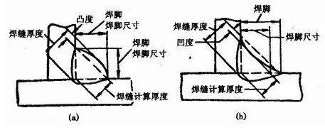 角焊縫的橫截面中,從一個(gè)直角面上的焊趾到另一個(gè)直角面表面的最小距離,叫做焊腳。在角焊縫的橫截面中畫(huà)出的最大等腰直角三角形中直角邊的長(zhǎng)度叫焊腳尺寸,見(jiàn)圖1—20。