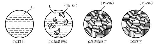 兩組元在液態無限互溶,在固態下有限溶解,通過共晶反應形成兩相機械混合物的二元相圖稱為二元共晶相圖。具有這類相圖的合金有Pb-Sn,Pb-Sb,Cu-Ag等。下面以Pb-Sb合金為例進行分析: