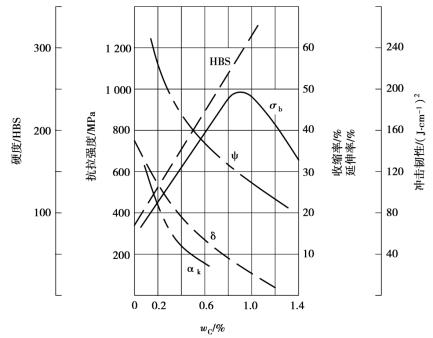 含碳量對碳鋼的力學性能的影響如圖1.3.15所示。隨著含碳量增加,鋼的強度、硬度增大,而塑性和韌性下降,這是組織中滲碳體量不斷增多,鐵素體量不斷減少的緣故。當w C>0.9%時,鋼的硬度不斷增加,但由于二次網狀滲碳體的存在,其強度明顯下降。