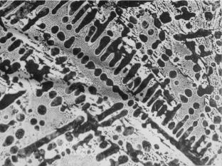 2.11%<w C<4.3%,結晶過程與共晶白口鐵基本相同,區別是共晶轉變之前有先結晶相A形成,因此其室溫組織為P+ Fe3 CⅡ+ L′d。結晶過程如圖1.3.11所示,顯微組織如圖1.3.12所示,圖中黑色點狀、樹枝狀為珠光體,黑白相間的為萊氏體,二次滲碳體與共晶滲碳體在一起,難于分辨。