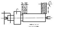 縱磨法(圖5.2.72)磨削外圓時,砂輪高速旋轉為磨削主運動,工件除了作圓周進給運動以外,還隨工作臺作縱向進給運動,在每單行程或往復行程終了時砂輪做周期性的橫向進給(即磨削深度)。磨削深度較小,磨削力小、磨削熱少,加之散熱條件又好,所以,縱磨法的磨削精度高,表面粗糙度R a值小。另外,縱磨法的適應性好,一個砂輪可以磨削不同直徑和不同長度的外圓表面,故其廣泛用于單件小批和大批量生產中。