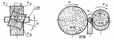 用無心磨床磨削(圖5.2.74),工件放在砂輪、導輪和托板之間。砂輪旋轉起切削作用。導輪是磨粒極細的橡膠結合劑砂輪。兩輪與托板組成V形定位面托住工件。導輪速度V導很低,一般為20~30 m/min,無切削能力,其軸線與工作砂輪軸線斜交β角。V導分解成V工與V進,V工用以帶動工件旋轉,實現圓周進給;V進用以帶動工件軸向移動,實現縱向進給。為了保證工件牢靠定位,必須把導輪與工件接觸部位修整成直線,即導輪圓周表面的母線必須為雙曲線。